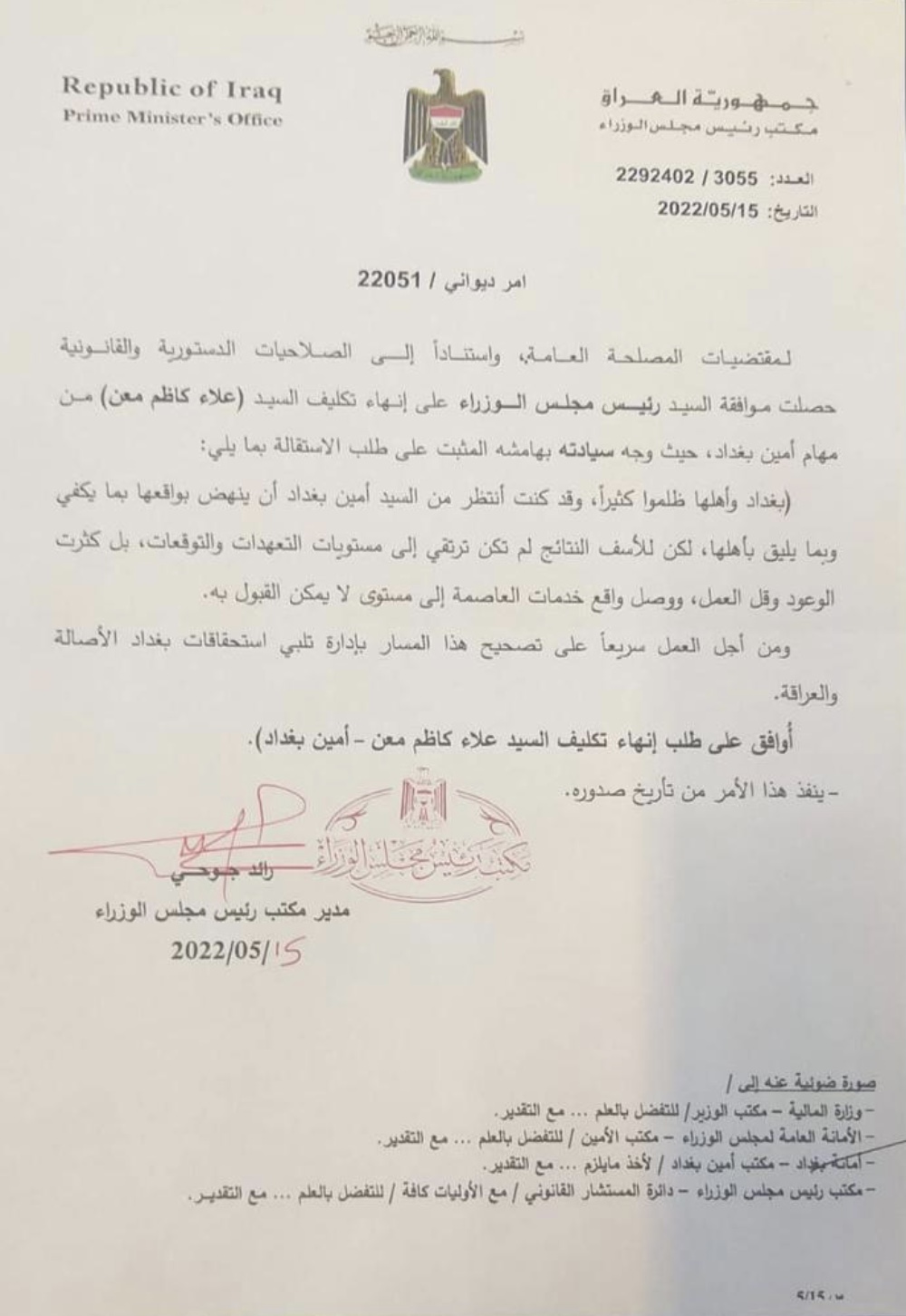 امر رئيس مجلس الوزراء مصطفى الكاظمي بإنهاء تكليف علاء معن من مهام أمانة بغداد استجابة لمخاطبة النائب الاول لرئيس مجلس النواب السيد حاكم الزاملي .