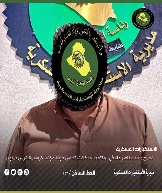 أعلنت خلية الإعلام الأمني ،اليوم الإثنين ، بتمكن الاستخبارات العسكرية الإطاحة بأحد عناصر داعش الارهابية غربي محافظة نينوى.