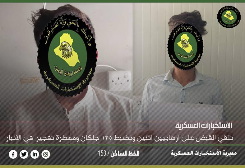 وقال المصدر ، إنه ” بعمليات نوعية واستباقية نفذت استناداً إلى معلومات دقيقة ، من مديرية الاستخبارات العسكرية وبالتعاون مع قوة من قيادة القوات البرية، أسفرت عن إلقاء القبض على أرهابيين إثنين ، بعد نصب كمين لهما في سيطرتي الكيلو سبعة والصقور في محافظة الأنبار “، موكداً أن ” المتهمان من العناصر الارهابية المطلوبة للقضاء وفق أحكام المادة الرابعة من قانون مكافحة الارهاب”.