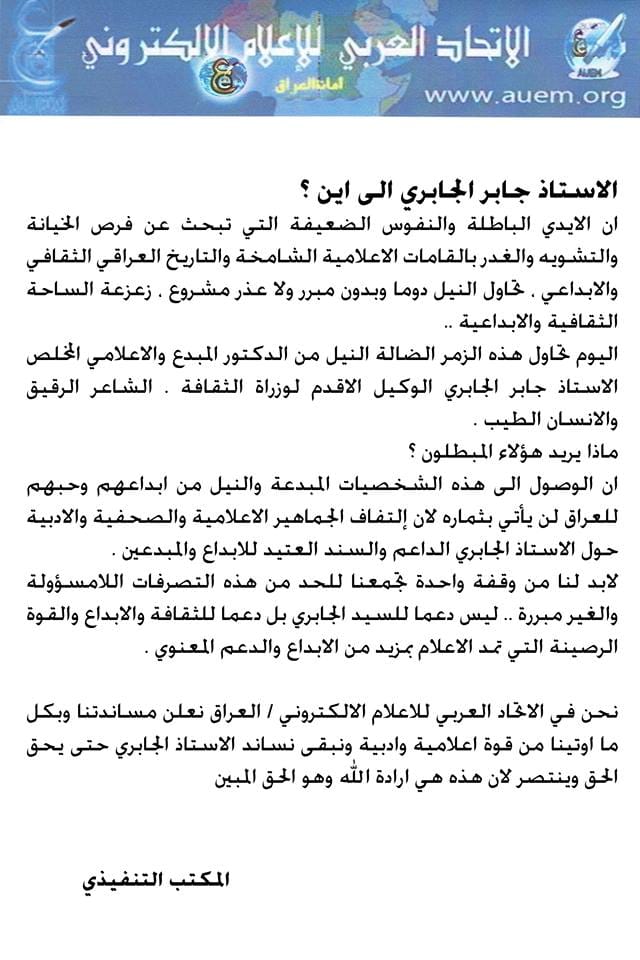 اصدر الاتحاد العربي لللاعلام الالكتروني /فرع العراق بيانا تضامنيا ومساندا للاستاذ جابر الجابري ،باثر مايتعرض له من محاولات استهداف حاليا.