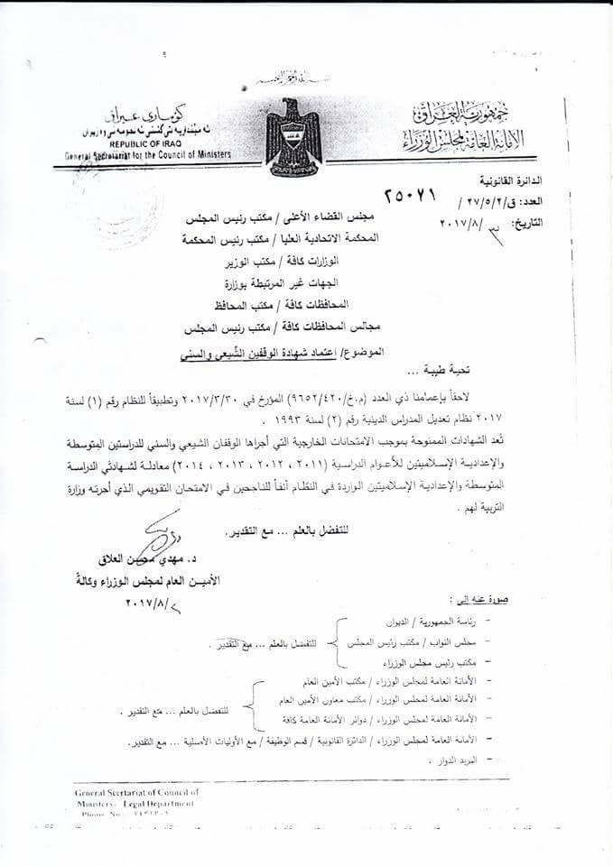 اصدرت الامانة العامة لمجلس الوزراء تعميما لكافة الوزارات والجهات الرسمية بمعادلة شهادة الامتحانات الخارجية للدراسات الاسلامية الخاصة بالوقفين الشيعي والسني للدراسة الاعدادية والمتوسطة لطلبة الامتحانات الخارجية .