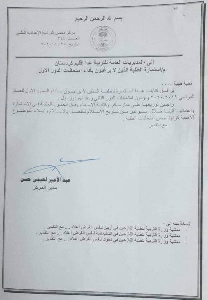 التربية تخصص استمارة للطلبة الذين لا يرغبون بإداء امتحانات الدور الأول للدراسة الاعدادية