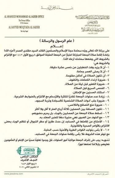 وذكر موقع المكتب الخاص للزعيم الصدر في بيان له وحصلت وكالتنا على نسخة منه ، ان السيد مقتدى الصدر (اعزه الله)وجه بإقامة صلوات الجمعة في العراق بدأً من الجمعة المقبلة ، مع الالتزام بالشروط الصحية المشددة التي ثبتت بعدة نقاط هامة وملزمة شرعيا وصحيا .انتهى