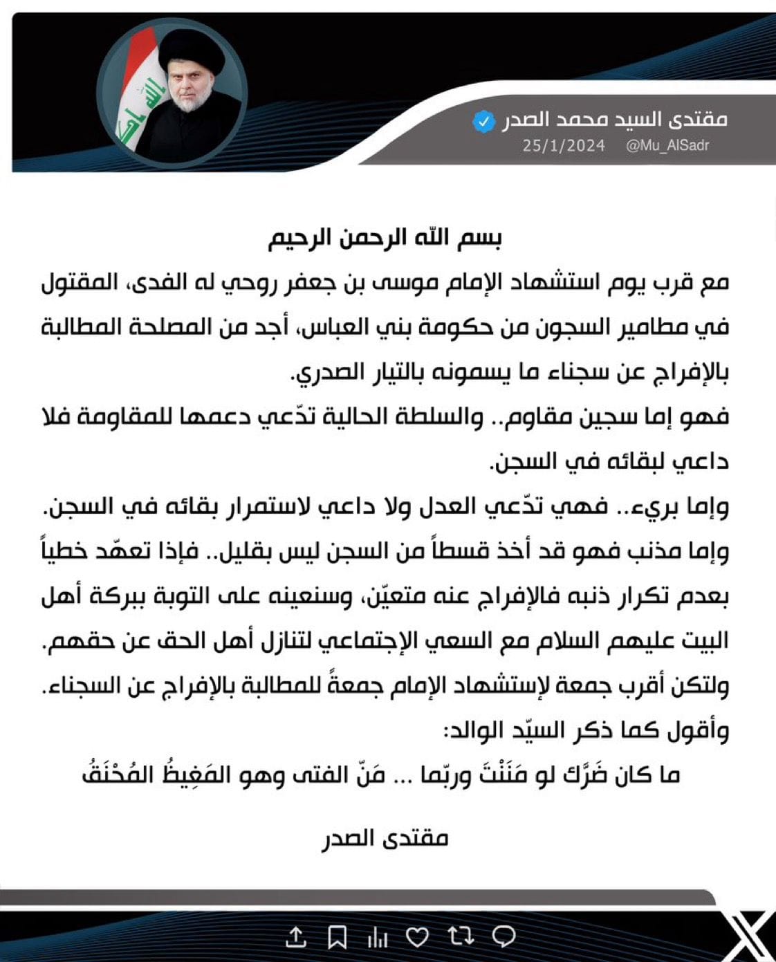 الصدر يطالب بالأفراج عن سجناء الخط الصدري بالتزامن مع ذكرى استشهاد الإمام موسى الكاظم (ع)ويحدد أقرب جمعة للمطالبة بذلك