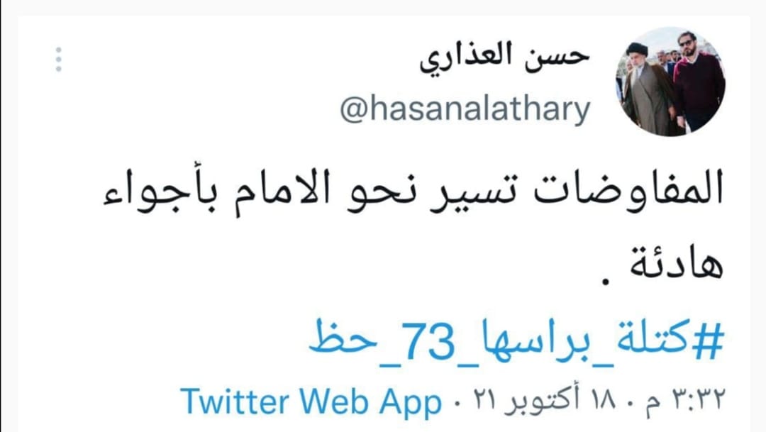 اكد رئيس اللجنة المفاوضة الممثلة عن زعيم التيار الصدري : مقتدى الصدر: حسن العذاري الفائز بالإنتخابات عن الكتلة الصدرية، إن المفاوضات تسير بأجواء هادئة، كما كتب على موقعه بالدارج الشعبي “الكتلة الصدرية بيها 73 حظ”