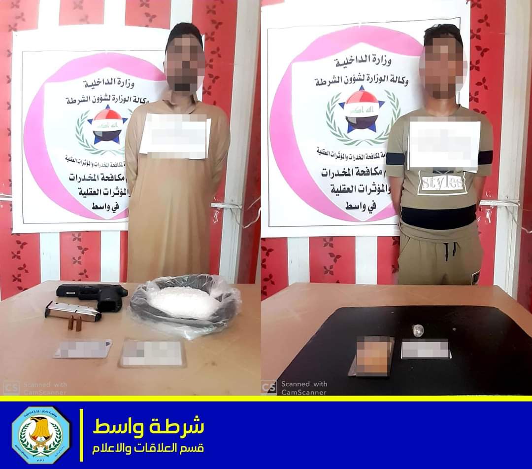 وبعملية نوعية مفارز قسم مكافحة المخدرات والمؤثرات العقلية تتمكن من القاء القبض على عصابة مكونه من شخصين تقوم بمتاجرة وتعاطي المواد المخدرة في قضاء الحي جنوب محافظة واسط .. وتضبط بحوزتهم نصف كيلو غرام من مادة الكريستال المخدرة وادوات تستخدم في تعاطي المواد المخدرة ومسدس نوع فايكن ..