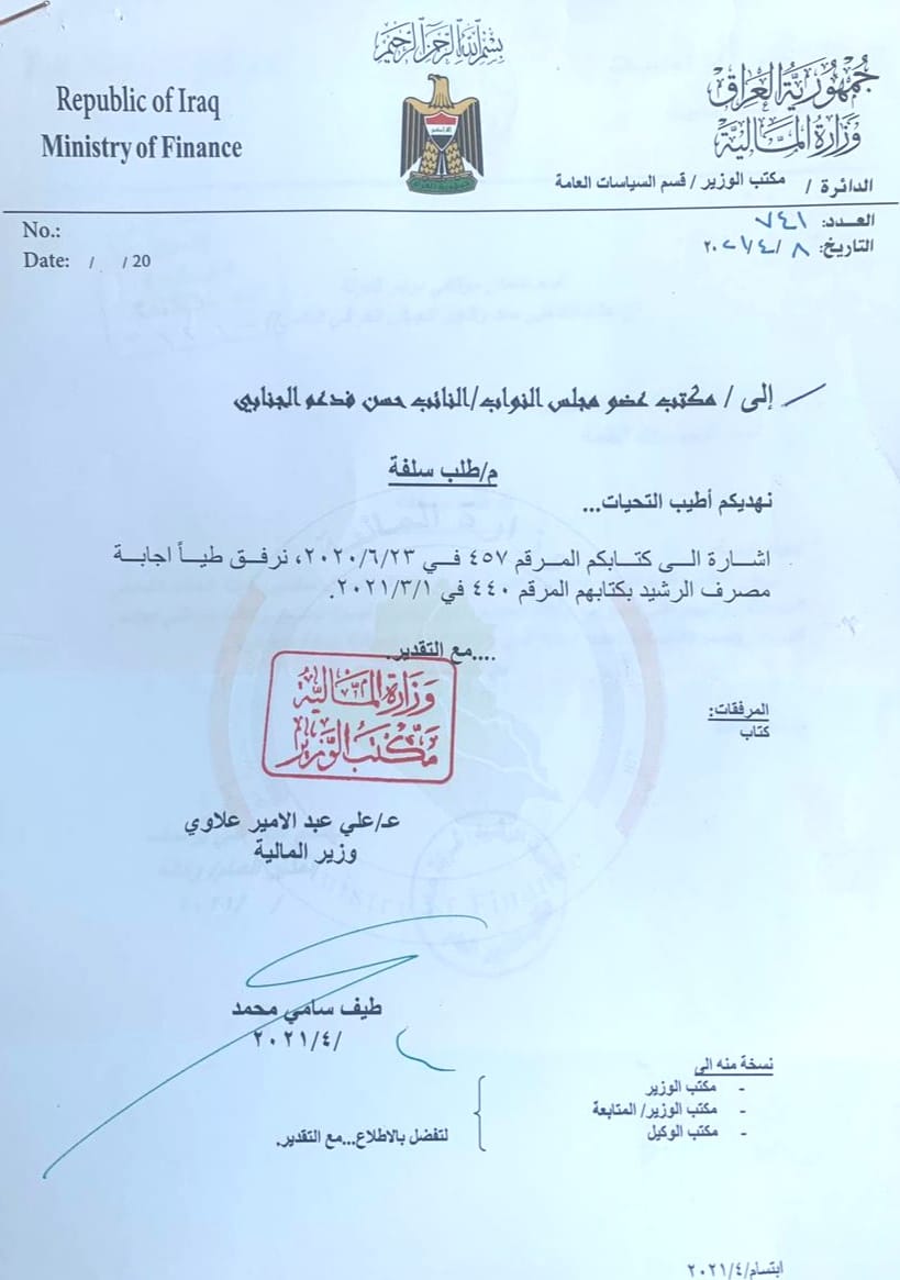 بالوثائق ..جهود ومتابعة النائب حسن فدعم الجنائي اثمرت بشمول منتسبي هيئة الحشد الشعبي الموطنة رواتبهم منح السلفة من مصرف الرشيد حاملي بطاقة النخيل أسوة بمنتسبي كافة موظفي الدوائر الدولة.انتهى