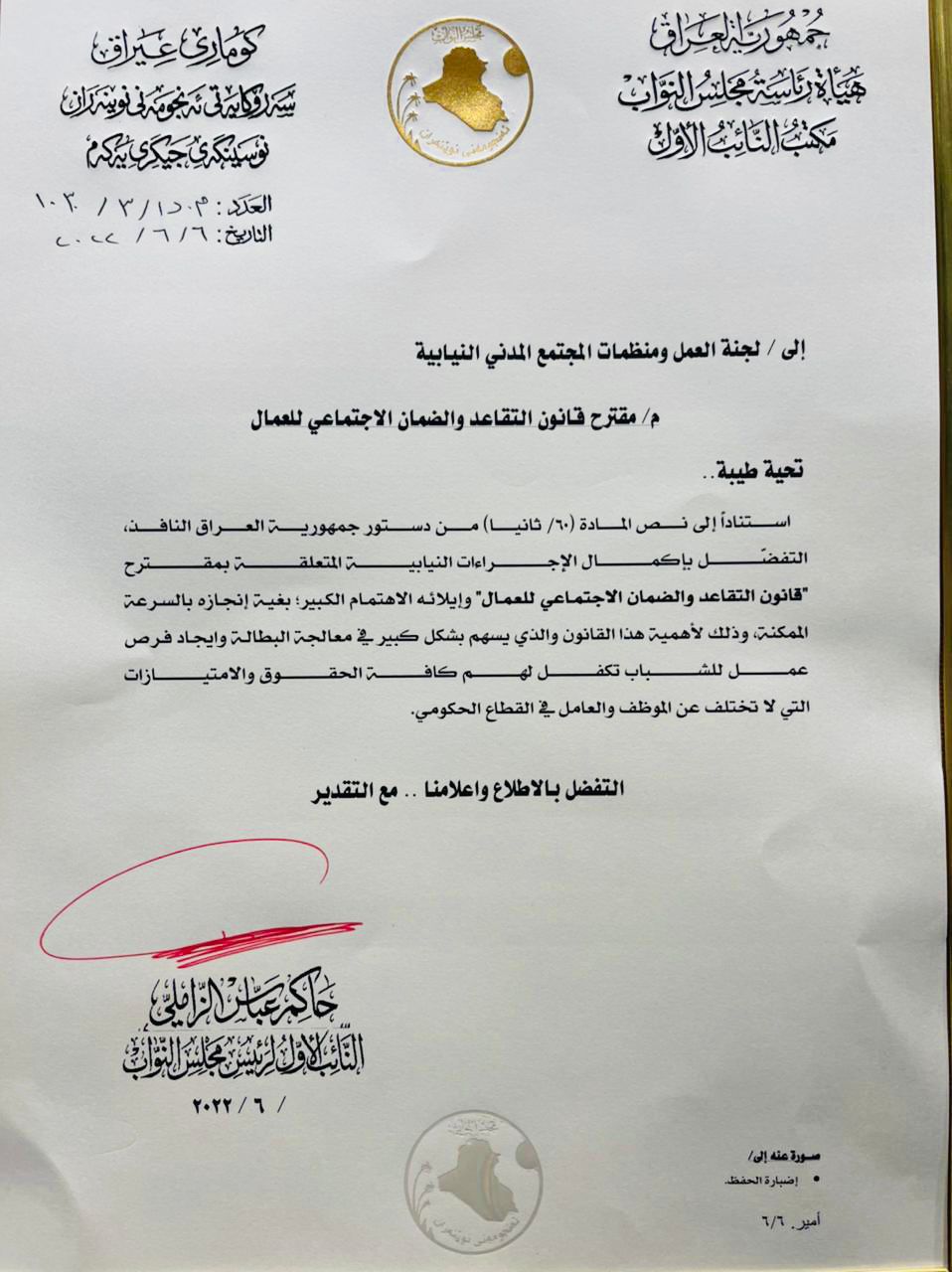 وجه السيد ” حاكم الزاملي ” النائب الأول لرئيس مجلس النواب , اليوم الاثنين 6 حزيران 2022 لجنتي ” الخدمات والإعمار ” و ” العمل ومنظمات المجتمع المدني ” النيابيتين بإكمال الاجراءات النيابية المتعلقة بمقترح قانون التقاعد والضمان الاجتماعي للعمال وايلائه الاهتمام الكبير ، بغية انجازه بالسرعة الممكنة .