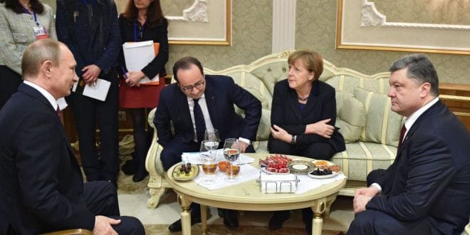 بدأ اجتماع “رباعية نورماندي” في برلين في مكتب المستشارة الألمانية أنجيلا ميركل، التي قامت بدعوة الرئيس الروسي فلاديمير بوتين والفرنسي فرانسوا هولاند والأوكراني بيوتر بوروشينكو.ووصل بوروشينكو إلى الاجتماع أولا. وجاء هولاند بعد بضع دقائق. ووصل بوتين أخيرا.