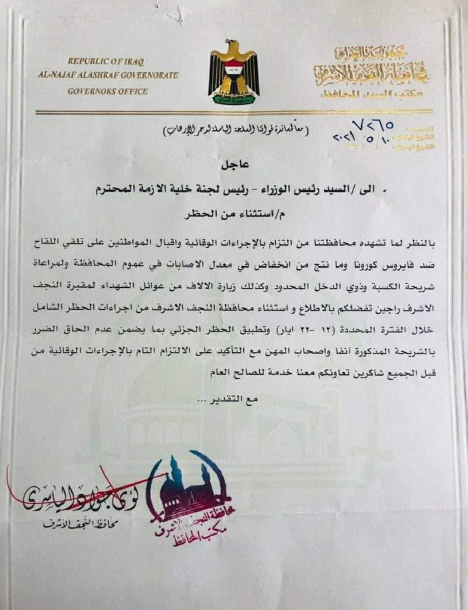 بعد الأنبار.. محافظة ألنجف الاشرف تطالب رئيس الوزراء باستثنائها من الحظر الشامل.انتهى