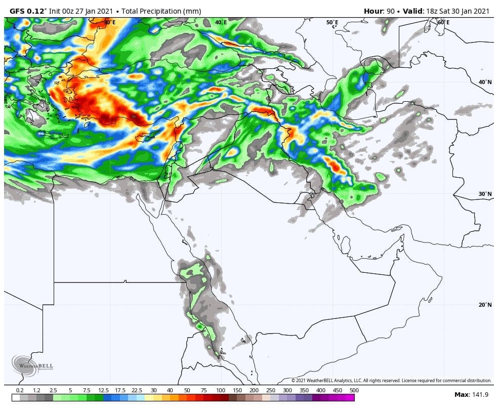 ونشر المتنبىء الجوي صادق عطية على حسابه اليوم (27 كانون الثاني 2021)، خريطة لبيان المناطق التي ستتعرض لتساقط الامطار خلال الايام المقبلة.