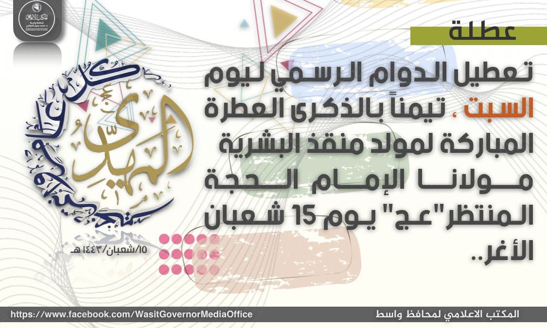 إتساقًا مع ذكرى الميلاد الميمون لسيدنا ومولانا الامام المهدي المنتظر عليه السلام وعجل فرجه الشریف، وجه محافظ واسط اليوم الخميس 17 /3/2022 بتعطل الدوام الرسمي للمدارس في عموم المحافظة ليوم السبت المقبل الموافق التاسع عشر من شهر مارس الجاري