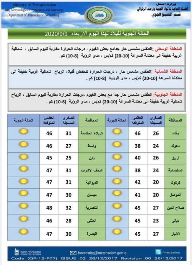 الحالة الجوية لهذا اليوم الاربعاء الموافق 9/9/2020 والصادرة من قسم التنبؤ الجوي في الهيئة العامة الانواء الجوية والرصد الزلزالي . انتهى