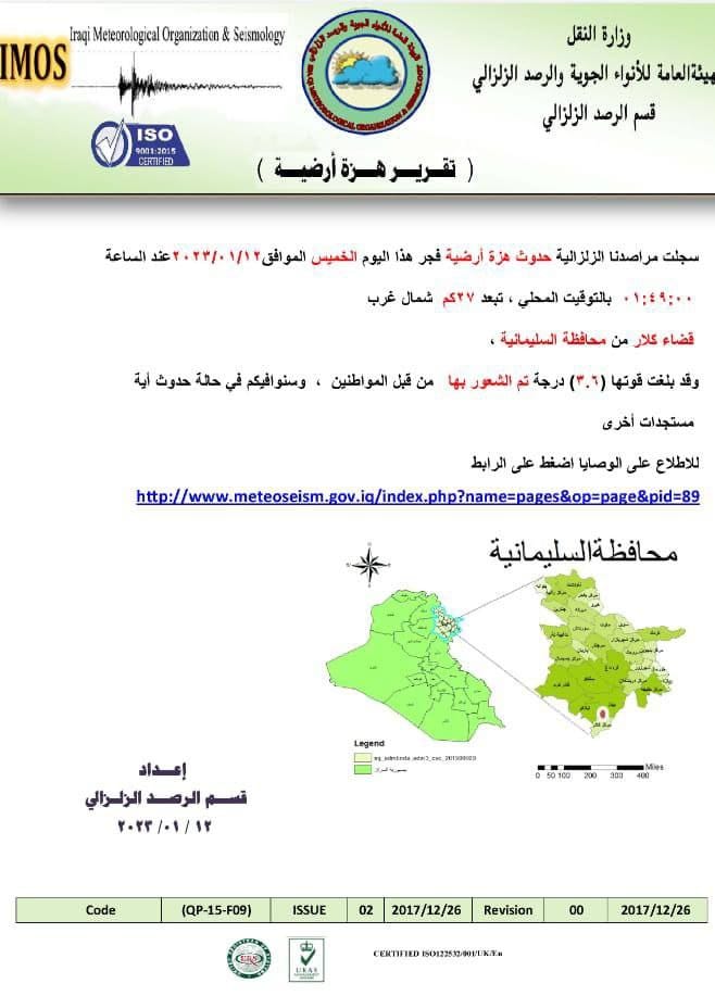 ولقد بغلت قوتها (٦. ٣) درجة،فيما تم الشعور بها من قبل المواطنين انتهى