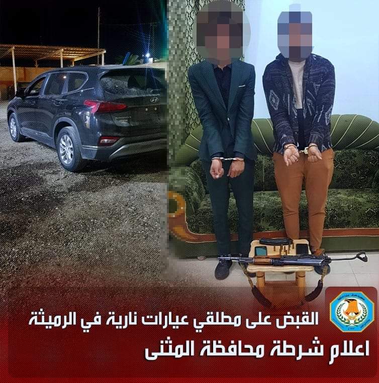 بتوجيه وبمتابعة من قبل قائد شرطة محافظة المثنى والمنشآت العميد المهندس محمد عيسى سبتي وبإشراف ومتابعة من قبل العميد ناصر ناهي ولأجل القاء القبض على المتهمين والخارجين عن القانون في عموم المحافظة ،من خلال تكثيف الممارسات الأمنية والواجبات اليومية وتفتيش العجلات والأشخاص المشتبه بهم واثناء الانتشار المكثف لدورياتنا في الشوارع والتقاطعات تمكنت دوريات ومفارز مركز شرطة المجد التابع الى قسم شرطة قضاء الرميثة وبأمرة ضابط المركز الرائد بهاء عظيم من القاء القبض على شخصين قاما بأطلاق العيارات النارية اثناء تواجدهما بحفل زفاف في احد الشوارع وسط الناحيه وقد ضبط بحوزتهما سلاح ناري نوع ( بندقيه كلاشنكوف نص اخمص ) وضبط العجلة التي كانوا يستقلونها وقد تم اتخاذ كافة الإجراءات القانونية بحقهما وفق القانون .