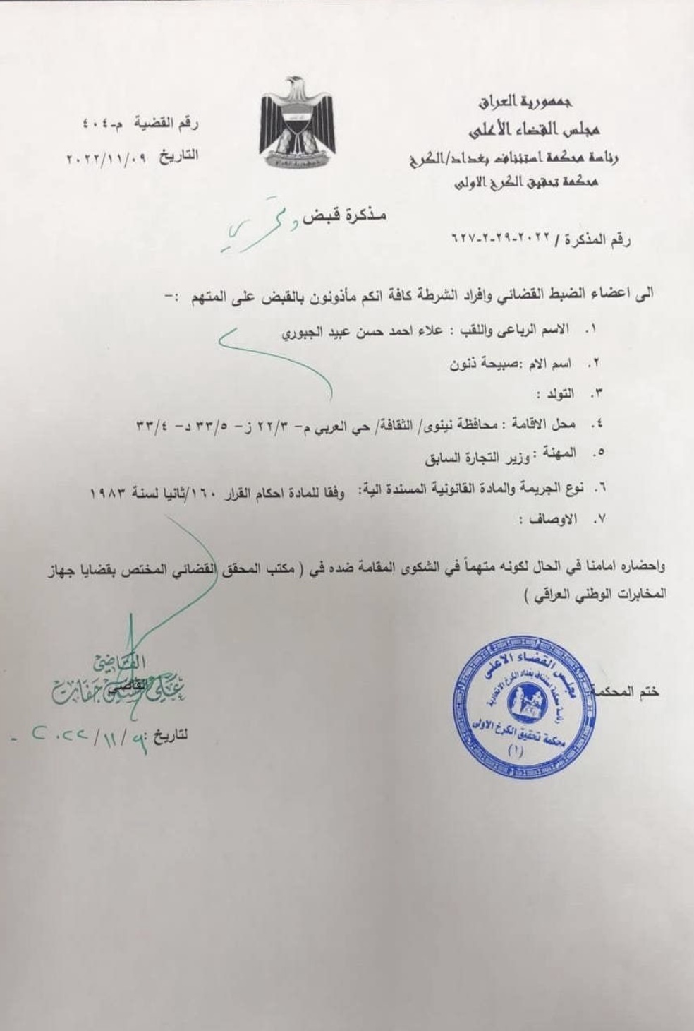 وبحسب وثيقة أطلعت عليها وكالتنا(21 تشرين الثاني 2022)، فإن المذكرة تأتي وفقًا للمادة أحكام القرار 160/ ثانيا لسنة 1983،وعليه فإن أعضاء الضبط القضائي مخولين بالقبض على علاء الجبوري ،الذي شغل منصب وزير التجارة بالحكومة السابقة وإحضاره ، لكونه متهماً بالشكوى المقامة ضده ،في مكتب المحقق القضائي المختص بقضايا جهاز المخابرات الوطني.