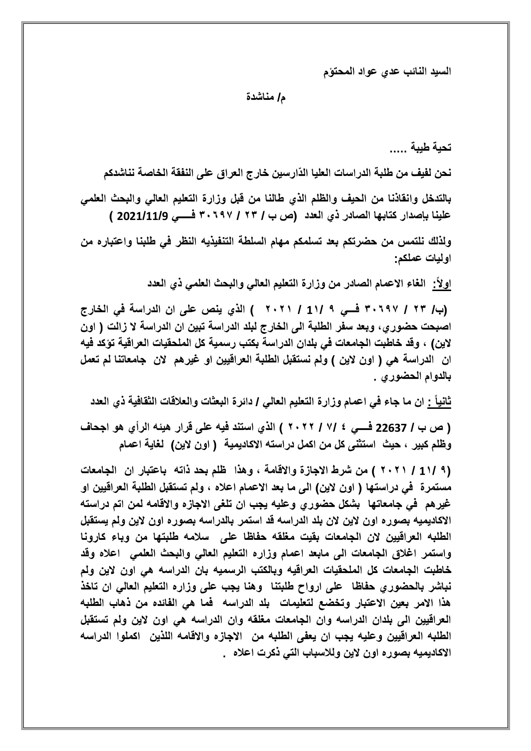 طالب الاف طلبة الدراسات العليا من الدارسين على النفقة الخاصة بالخارج ، بالتدخل الفوري من قبله وانشالهم من حالة الغبن التي لحقتهم جراءالاجراءات التي وصفوها ب (المخالفة) لما اقر ومن توصيات وتعليمات خاصة بالدراسة خلال فترة وباء (كورونا) واعتماد الدراسة اون لاين من قبل الجامعات الي يدرسون فيها