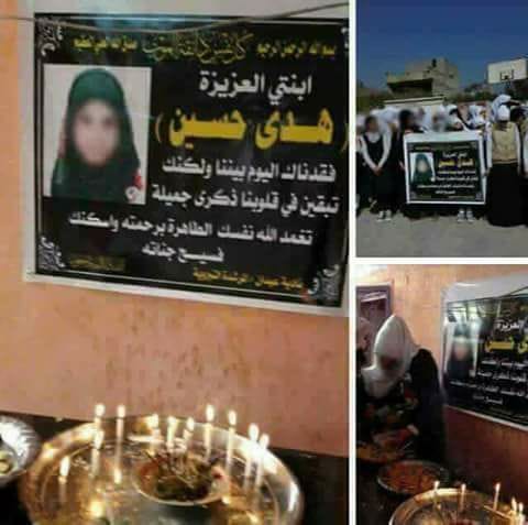 قمت اليوم انا وزميلاتها بعمل مجلس تابيني لها وطبعت صورتها واشعلنا الشموع والبخور ووزعنا الحلوى وحكيت حكايتها للطالبات لتكون لهم نبراس وقوة فرغم كل الماسي هدى نجحت بالامتحانات في نصف السنة لكنها لم تفرح بنتيجتها اذ اختارها الله الى جواره وسلمنا نتيجتها لاهلها فالف مبروك لك ياابنتي رحمك الله برحمته الواسعة وصبرنا على فراقك بحق محمد وآل محمد